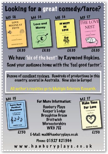 LOVE BEGINS AT FIFTYPublished 1998 M3 F6 £6-95 H185205 229 5Matrimonial mix-up in the funniest farce we have ever published. Featured in the 'Play Produced' feature in Amateur Stage. Over 150 performances to date. Anita and Clive Debanks have been married for 28 years and have led an uneventful life. But all that is about to change. Although in a loveless marriage, Clive has never been unfaithful. However, as preparations for his fiftieth birthday are underway, Clive feels that life is passing him by and has a yearning for a final fling. To this end, he chooses three prospective partners from the 'lonely Hearts' column in the local paper. By a strange twist of fate, the same paper is offering a Caribbean cruise, as the first prize, in a competition to find the perfect married couple. Anita enters the competition but keeps it a secret form Clive. A photographer arrives to take the pictures of the happy couple the night Anita is away, but Clive is busy entertaining one of his new dates. From that point onwards, things get a little complicated, to say the least. The action is fast and furious in this hilarious farce, one of the funniest we have ever published. Some Press opinions"This is one of the most frenetically funny farces I have reviewed for some time, up to the standards of the best Ray Cooney … side-splitting laughter … a fast and furious farce which provides hilarious opportunities." LOVE BEGINS AT FIFTY has been a great success. As well as a record - breaking season as a summer show at Torquay, it has been performed by amateur companies throughout the country. In 2001 we published IT MUST BE LOVEThis new farce was booked for another summer show in Torquay.6m 4w £ 6-95 185205 257 0 The plot twists and turns in a frantic manner right up to the surprise ending. Jason Taylor; a quiet unassuming person, is one week away from marrying Lucinda, his childhood sweetheart. The overzealous bride's mother, Stella Parsons, has turned the wedding into a personal crusade. No expense has been spared and a year's preparations have all come together to make it the event of the decade. Lucinda, who has always been dominated by her mother, has gone along with the lavish arrangements. As the wedding looms ever closer, everything is on track. That is, until Julie, a girl from the local florists, calls at the Taylors' to make some final arrangements. By a twist of fate, Jason is at home alone. Their inevitable first meeting sparks off that magical chemistry which makes two people fall hopelessly in love. From that point on, the plot twists and turns in a frantic manner, making the wedding a far more memorable occasion than even Stella could have imagined. THE LOVE NESTM2 F7 £6-95A third farcical comedy by the author of the LOVE BEGINS AT FIFTY. Set in a seaside guest house where misfortune follows misfortune - but 'all's well that ends well'. Or is it?H185205 258 9 David and Janet Thompson were deeply in love when they married thirty-two years ago. Their future seemed destined for marital bliss. That was until Janet's mother, Marjorie, moved in with them. From that day onwards, things started to go downhill. Their relationship has now reached an all-time low. Ina last attempt to save the marriage, the couple have decided to return to the guest house where they spent their honeymoon. The idea being that they will rekindle the lost feeling of warmth and affection they used to share and live happily ever after. If only life was that simple. The second honeymoon is doomed from the beginning. The guest house is going through a bad patch. Marjorie decided to come along and upset everyone. David is pursued by an over-zealous waitress, a frustrated newly-wed and an admirer from the past turn the whole week into a farce. Will true love win through in the end? Only Tyson, the mouse, has the answer. LOVE AND MONEYM4 F4 one set £6-95 ISBN 185205 2686A farcical comedy from the master of the art who's previous plays have been a runaway success, being performed hundreds of times to full houses of delighted audiences. What happens when the family have a robbery and try to claim the insurance payment? Not a subject for a farcical comedy? Don't you believe it! The twist and turns, the intrigues, the misunderstandings and the falling-outs are as funny as ever: And all this takes place in one simple setLOVE AND PERFECT HARMONYM4 F5 one set £7-50 H1852053062( 9781852053062)This is the fifth play by Raymond Hopkins whose first play LOVE BEGINS AT FIFTY has been performed many times both in this country and, more recently, in Australia. On at least two occasions, it has been chosen for the summer season at seaside towns and has played to large audiences. His plays that followed IT MUST BE LOVE, THE LOVE NEST and LOVE AND MONEY have been great successes. This play, unlike the others, is a comedy rather than a farce and includes four original songs which can be sung or mimed. The full music score is included in this script. The action takes place in a back room of the local Corn Exchange in the south of England where the local choral society hold their rehearsals. Their intrigues, quarrels and successes all add up to a most amusing, entertaining evening. Hardly any scenery or furniture is required which makes for ease in staging. NEW June 2008 MAKE TIME FOR LOVECAST:- M2 F7 one set £7-50 ISBN 978185205 3208A comedy in two acts. The sixth play by this highly popular playwright whose plays have topped our charts in the UK and Australia. It all started with Love Begins at Fifty - now performed hundreds of times to delighted audiences. A recent production, performed for ten nights , was sold out every night of the run. His plays that followed - The Love Nest, Love and Money, It Must be Love and Love and Perfect Harmony have all been very popular with amateur drama groups. MAKE WAY FOR LOVE, with its domestic setting and a string of matrimonial misunderstandings, promises to be yet another success. The author is donating 